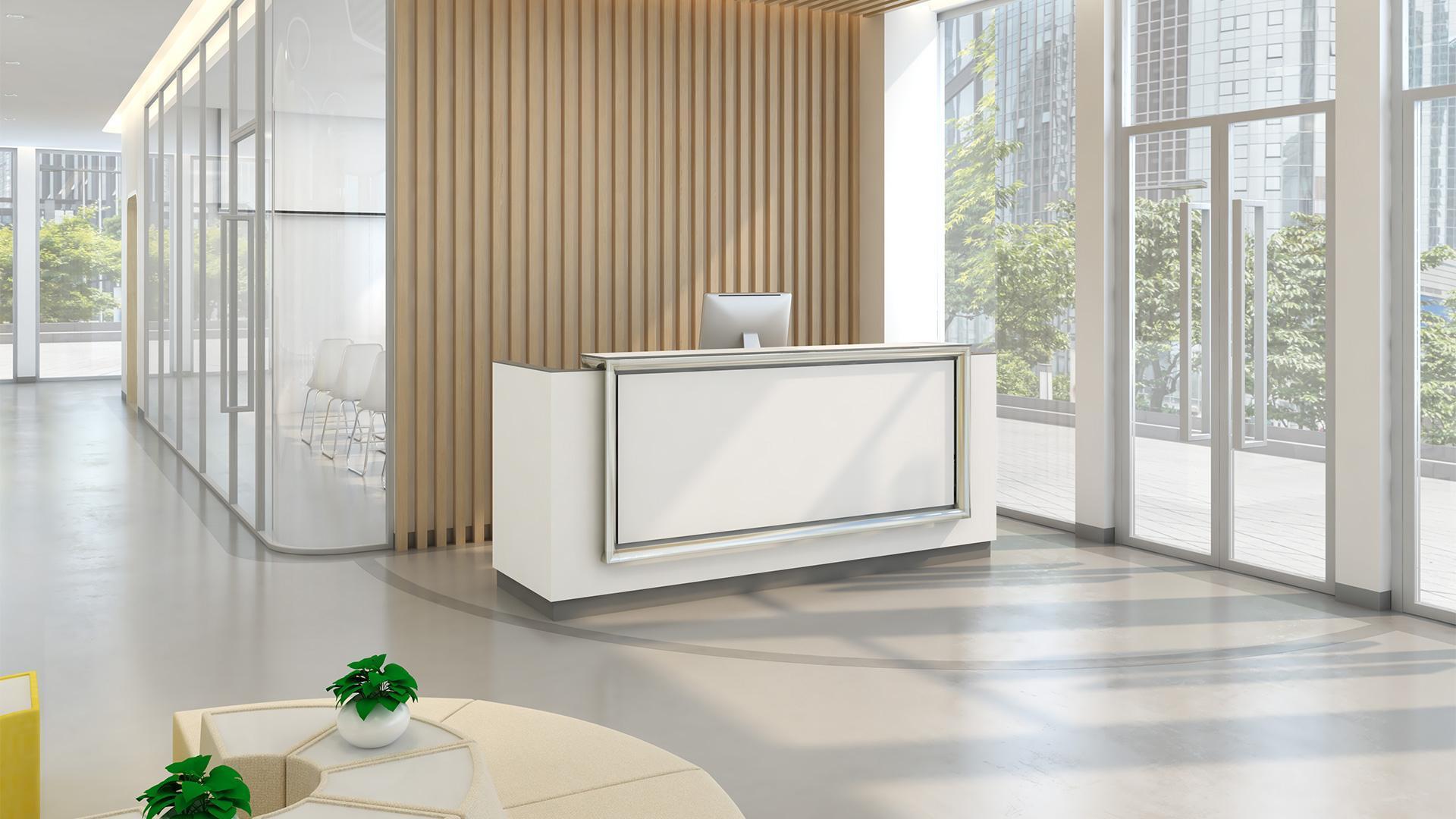 Les comptoirs de réception sont fabriqués en mélamine avec une structure métallique.